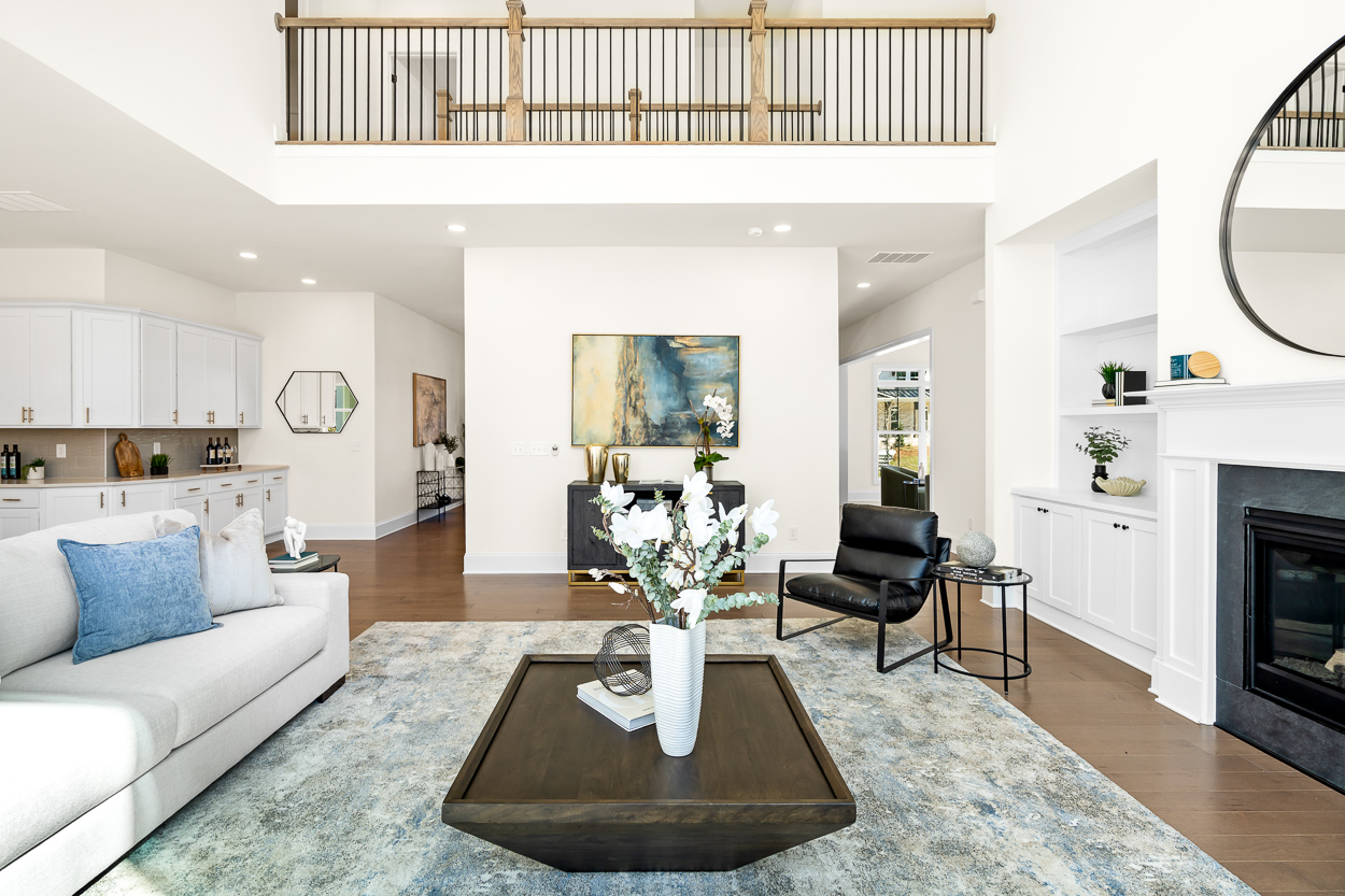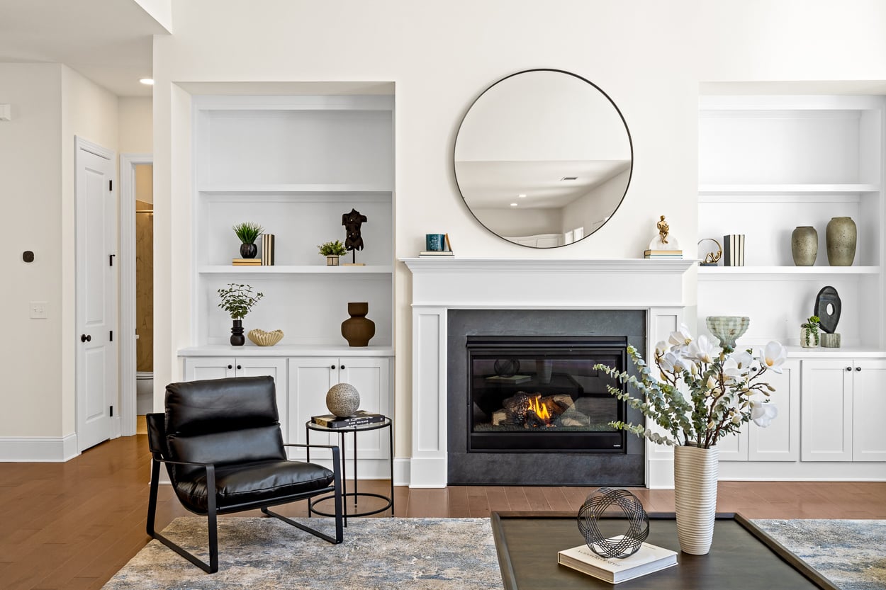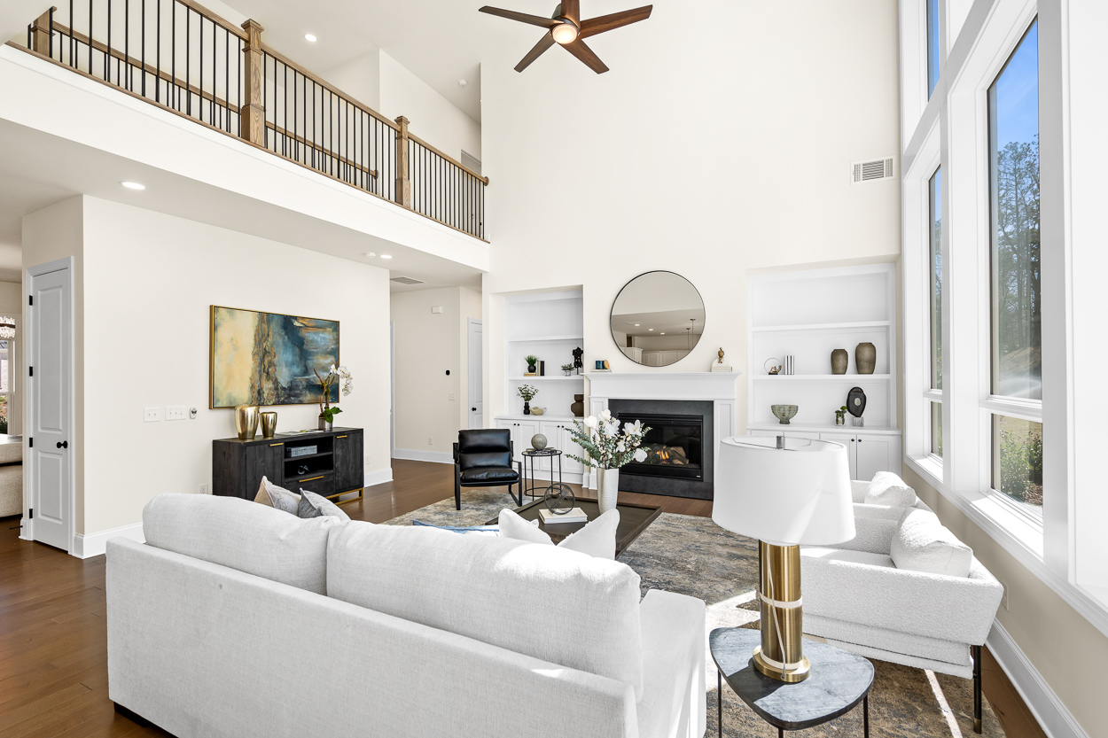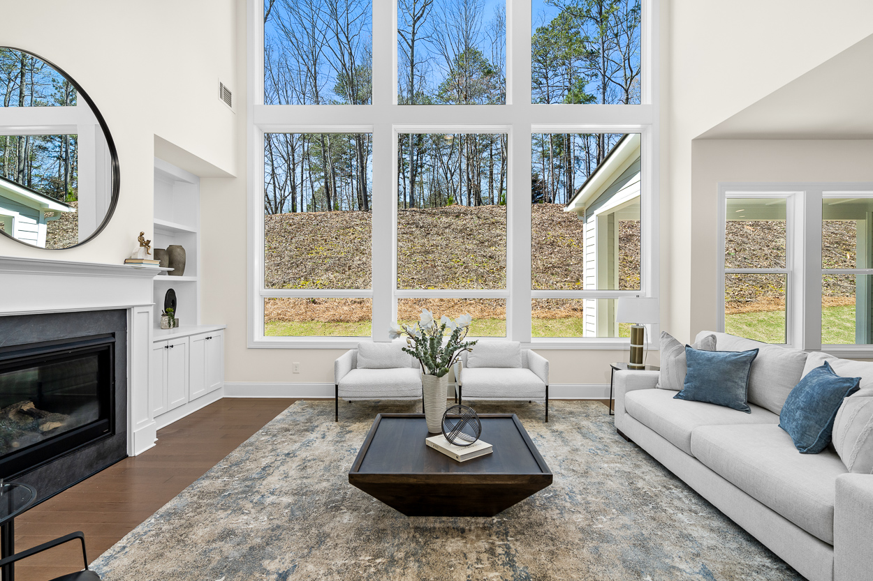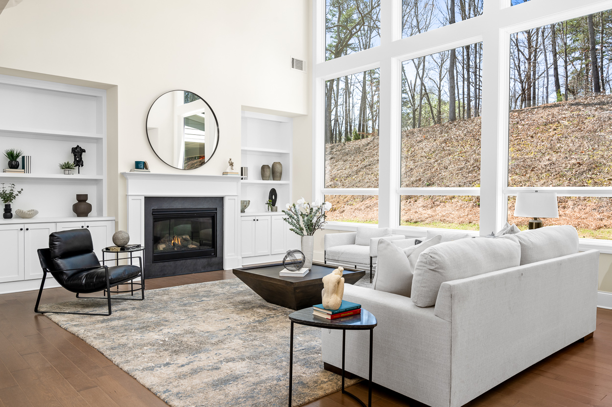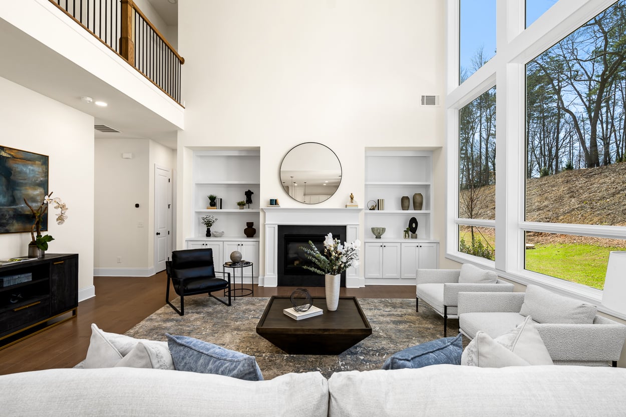 - Open Concept Great Room: Gas fireplace with built-ins, soaring linear window wall, hardwood floors