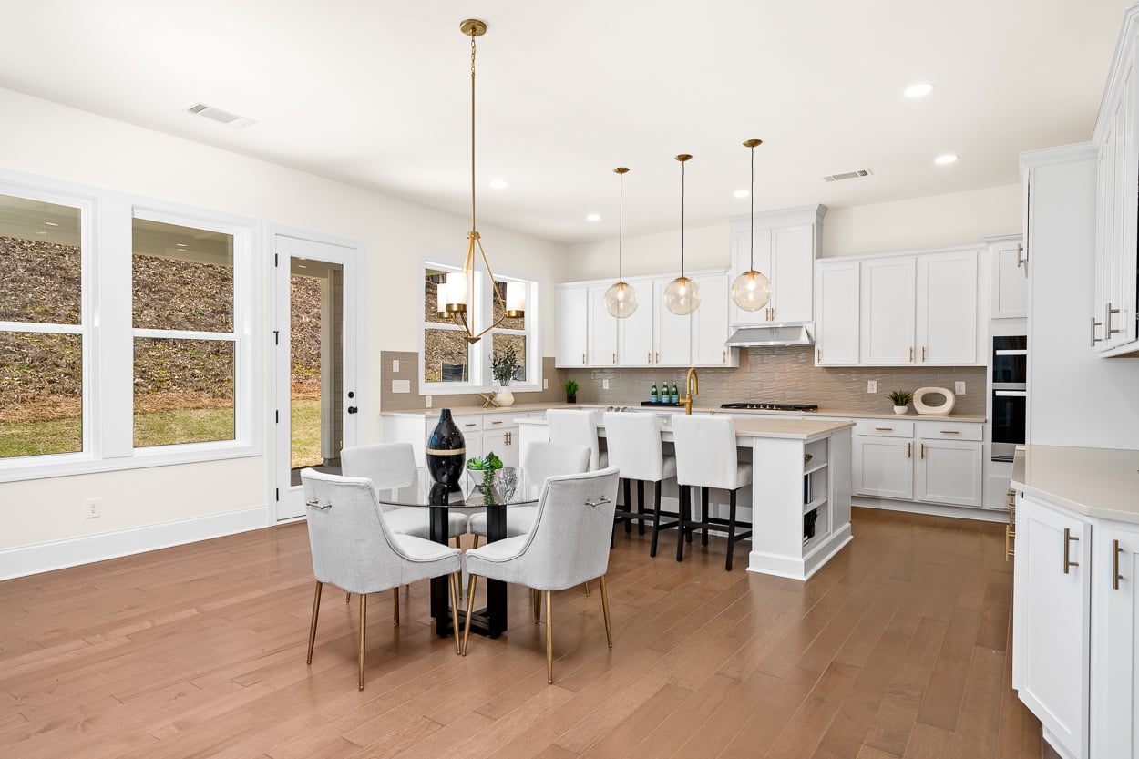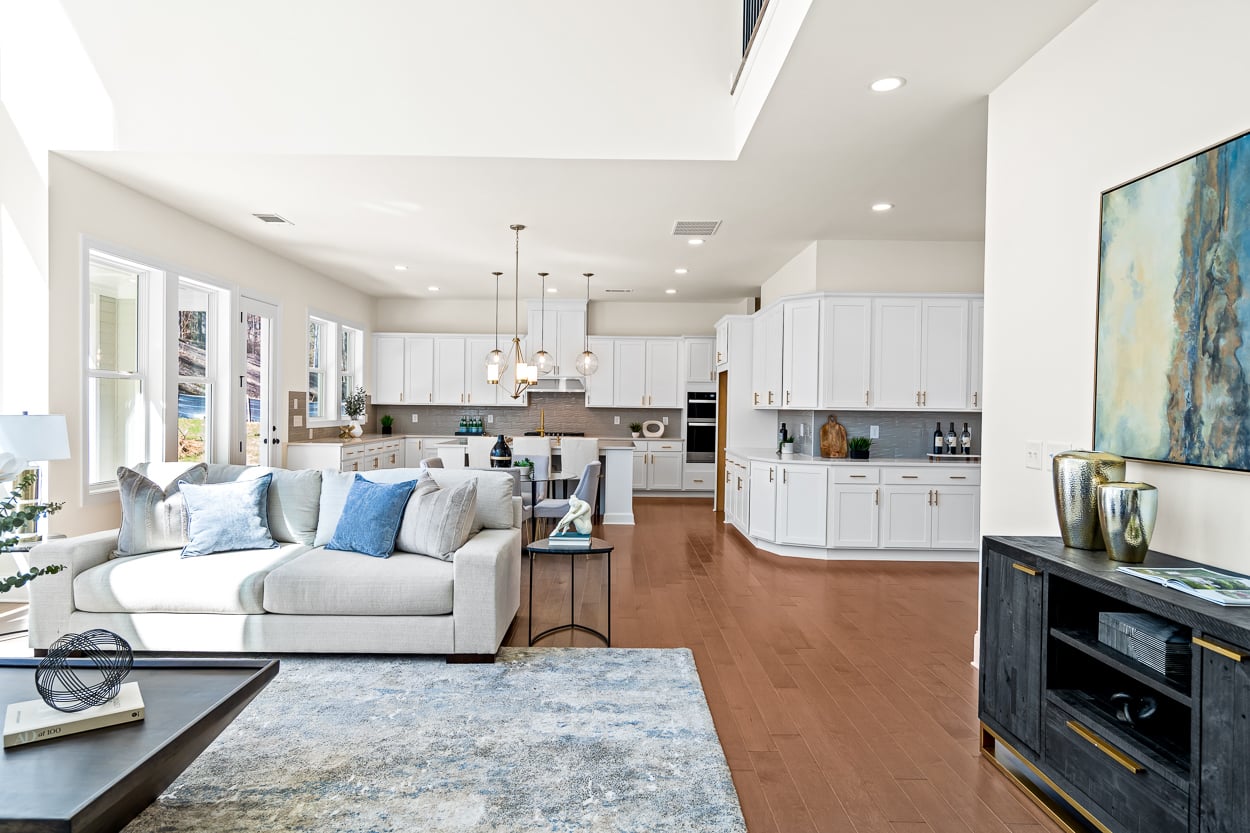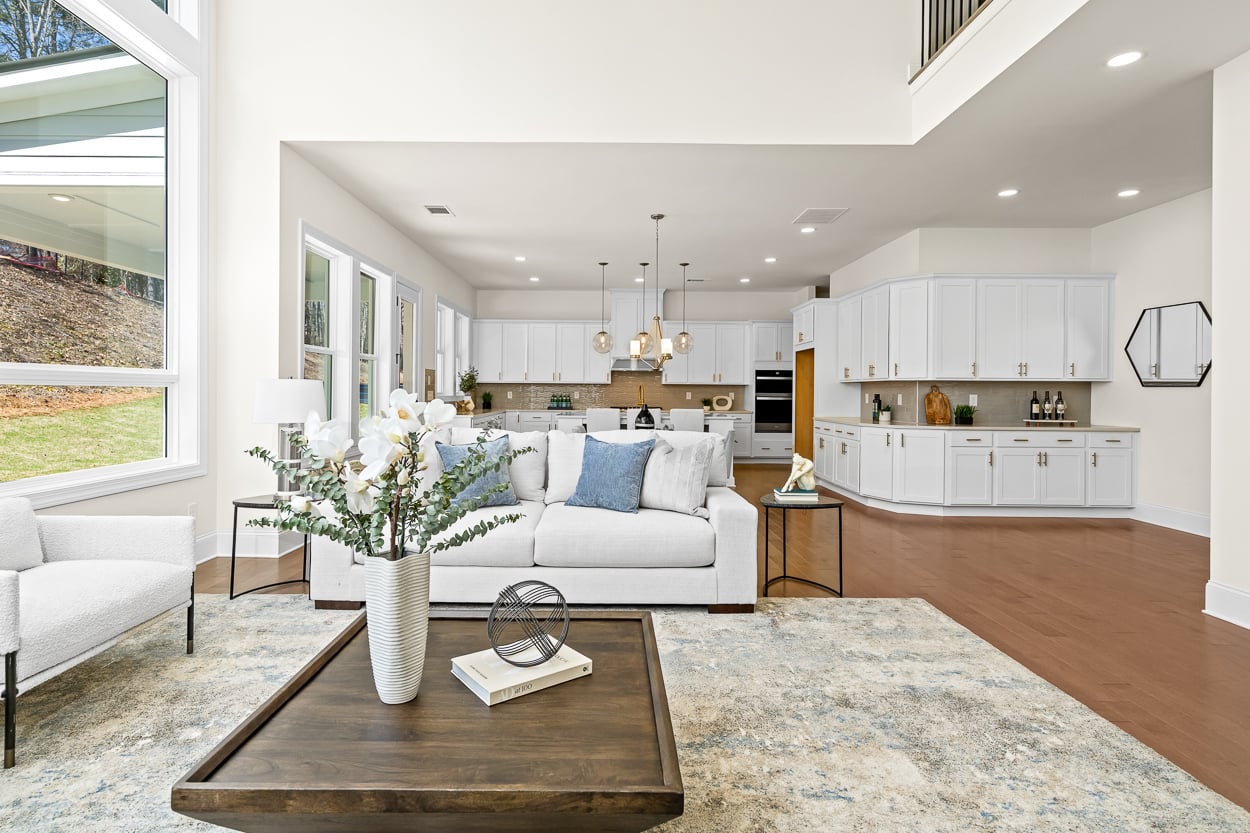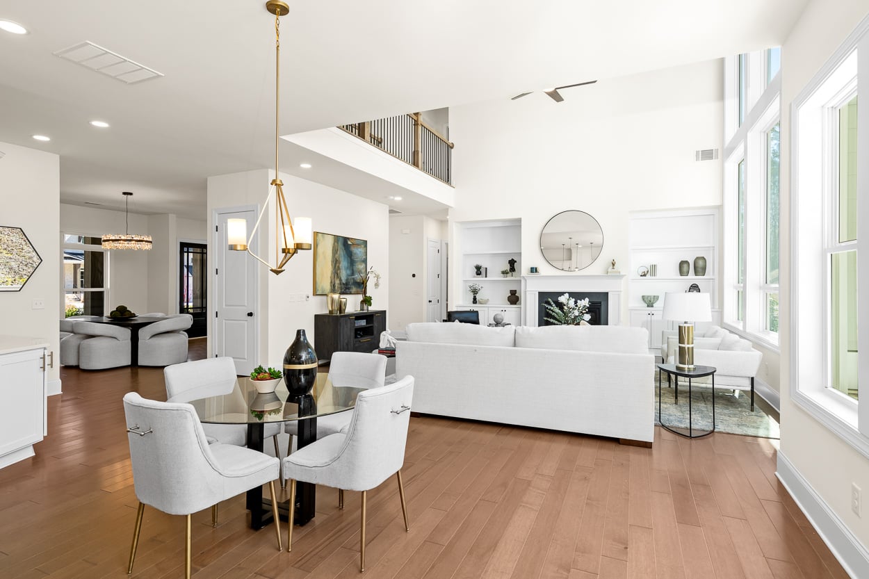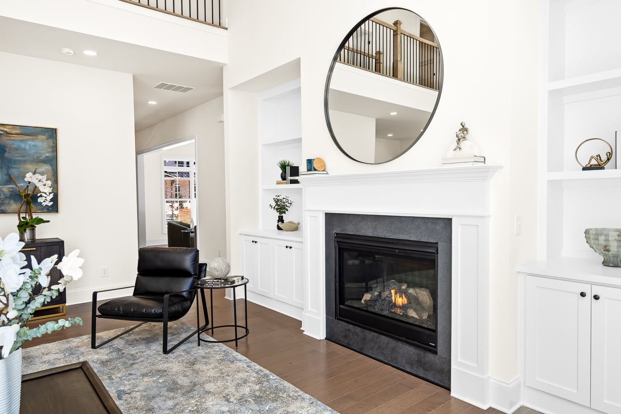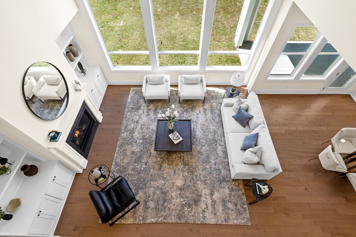 - Open Concept Great Room: Gas fireplace with built-ins, soaring linear window wall, hardwood floors