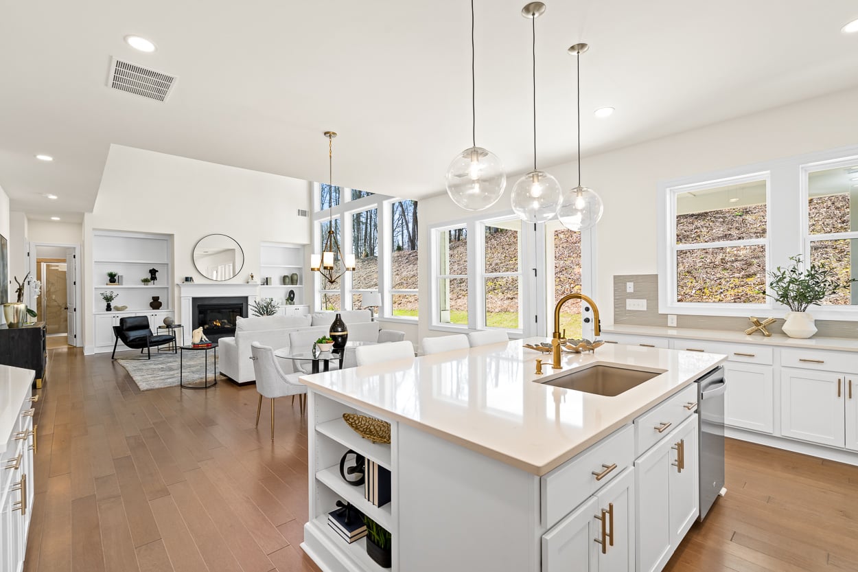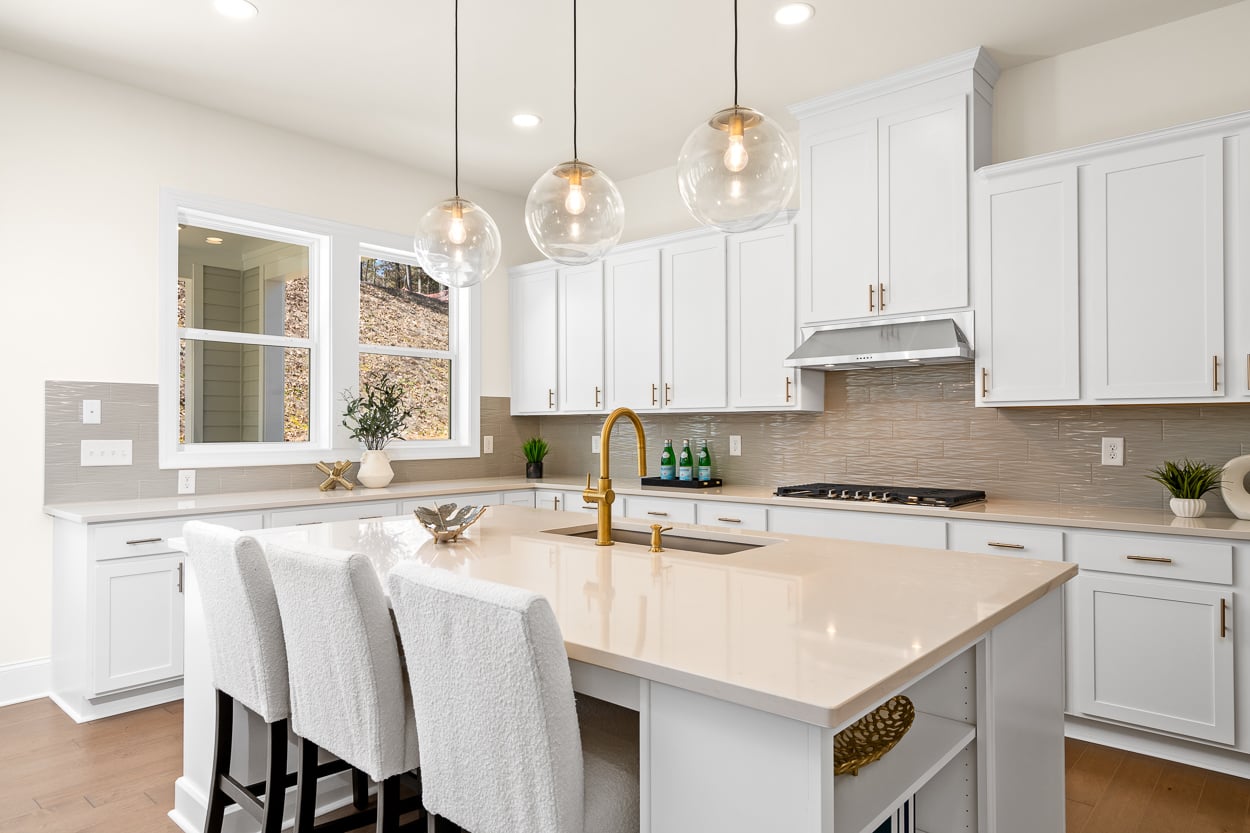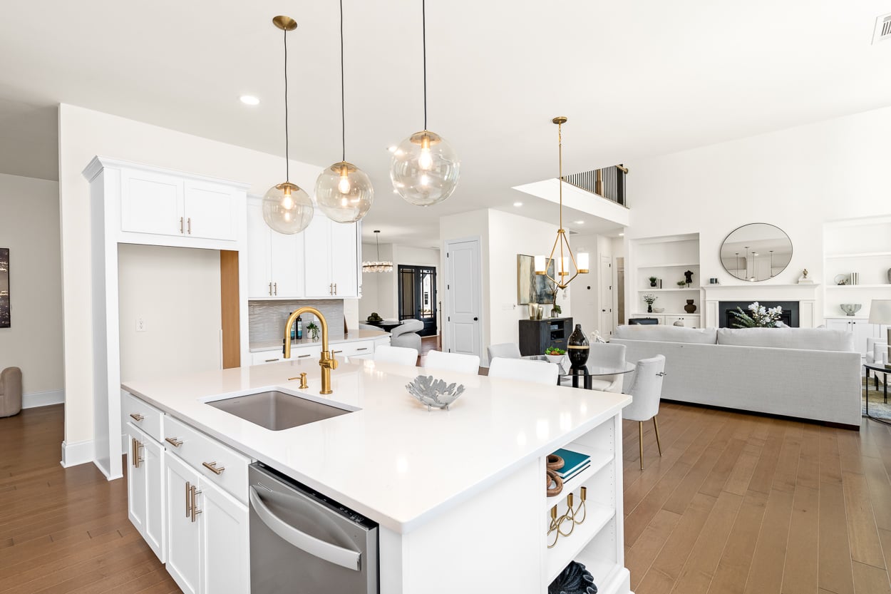 - Oversized Center Island: Seats four with open shelving, undermount sink, and gold gooseneck faucet