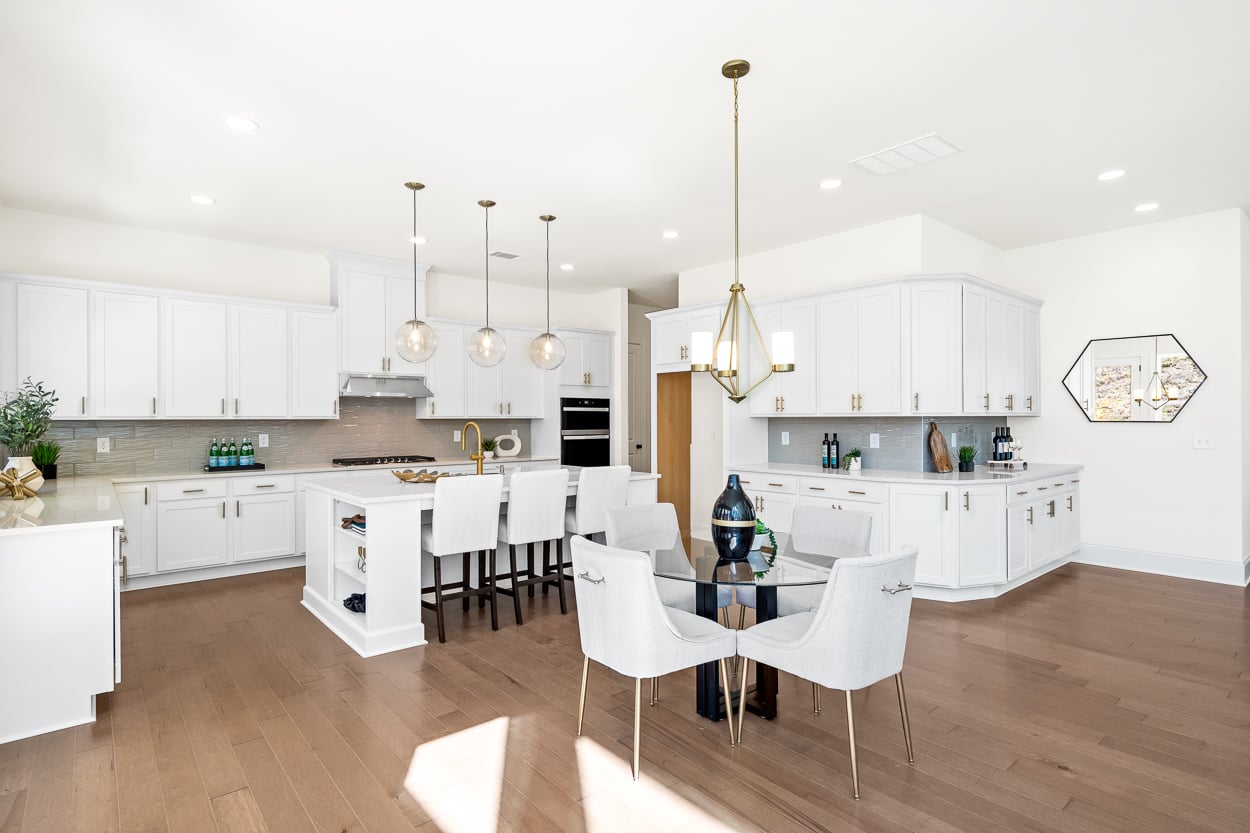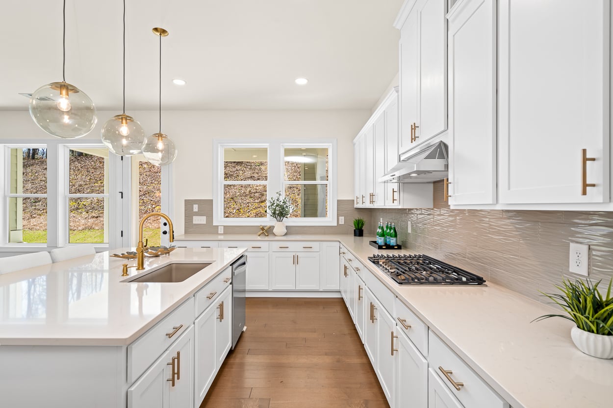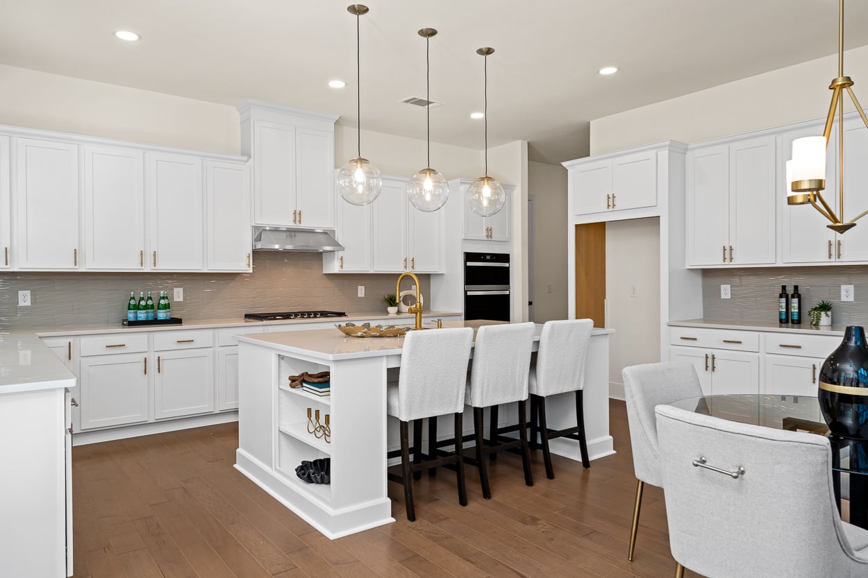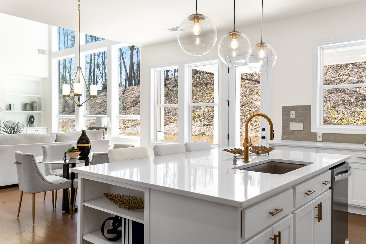 - Oversized Center Island: Seats four with open shelving, undermount sink, and gold gooseneck faucet