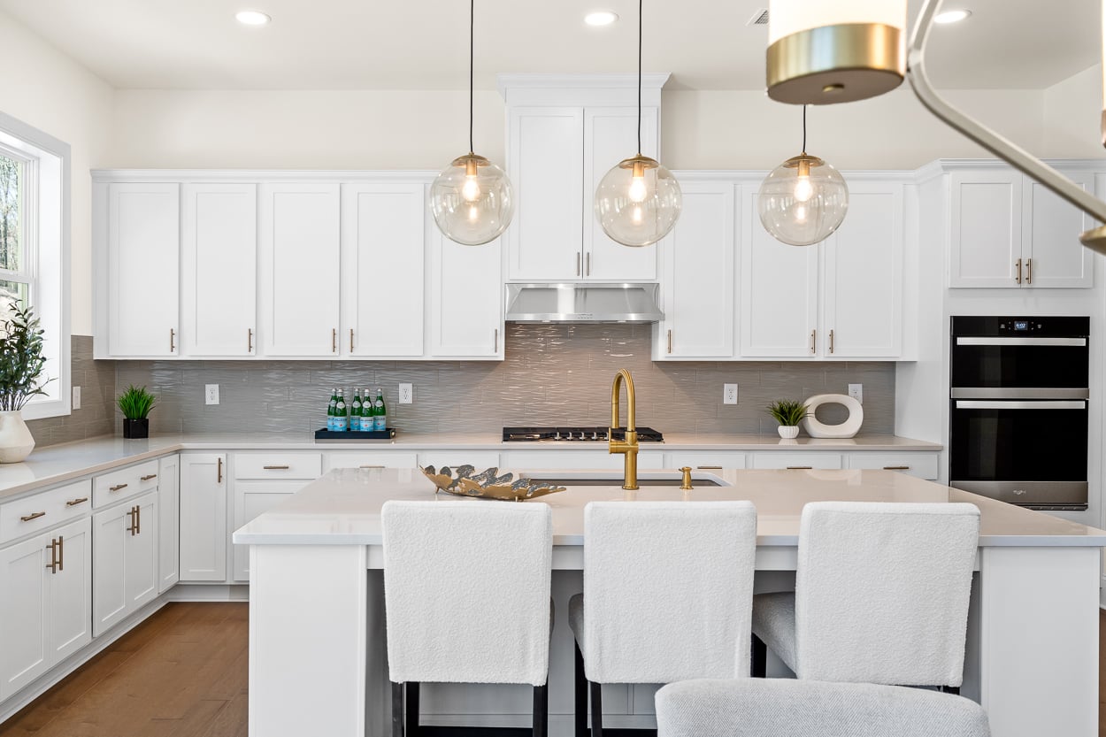 - White Shaker Cabinetry: Floor-to-ceiling with crown molding and brushed gold hardware throughout