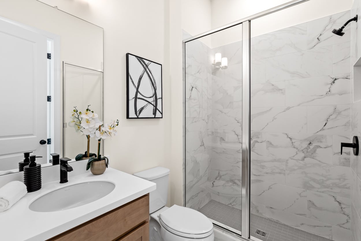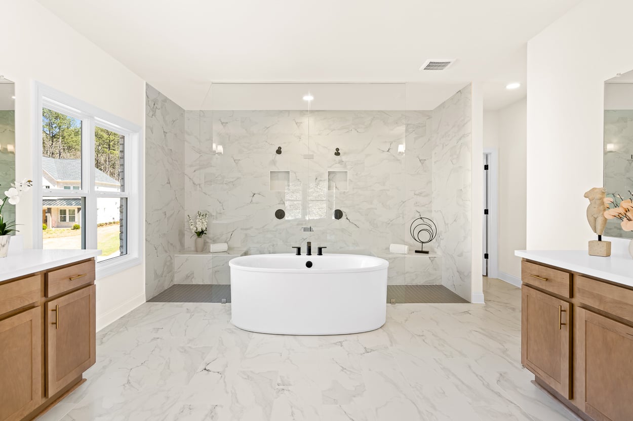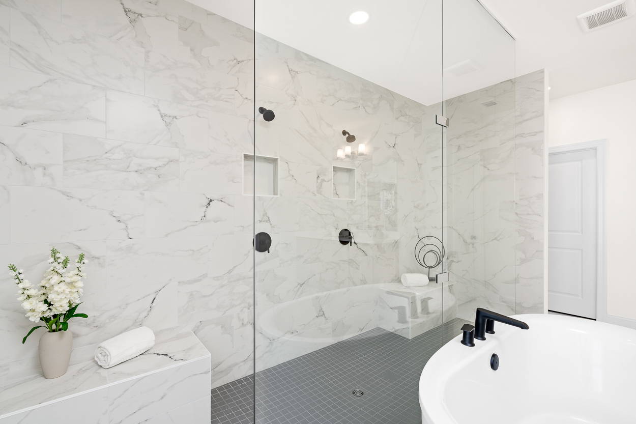 - Dual-Head Marble Shower: Two independent shower heads, dual controls, built-in niches, and bench seat