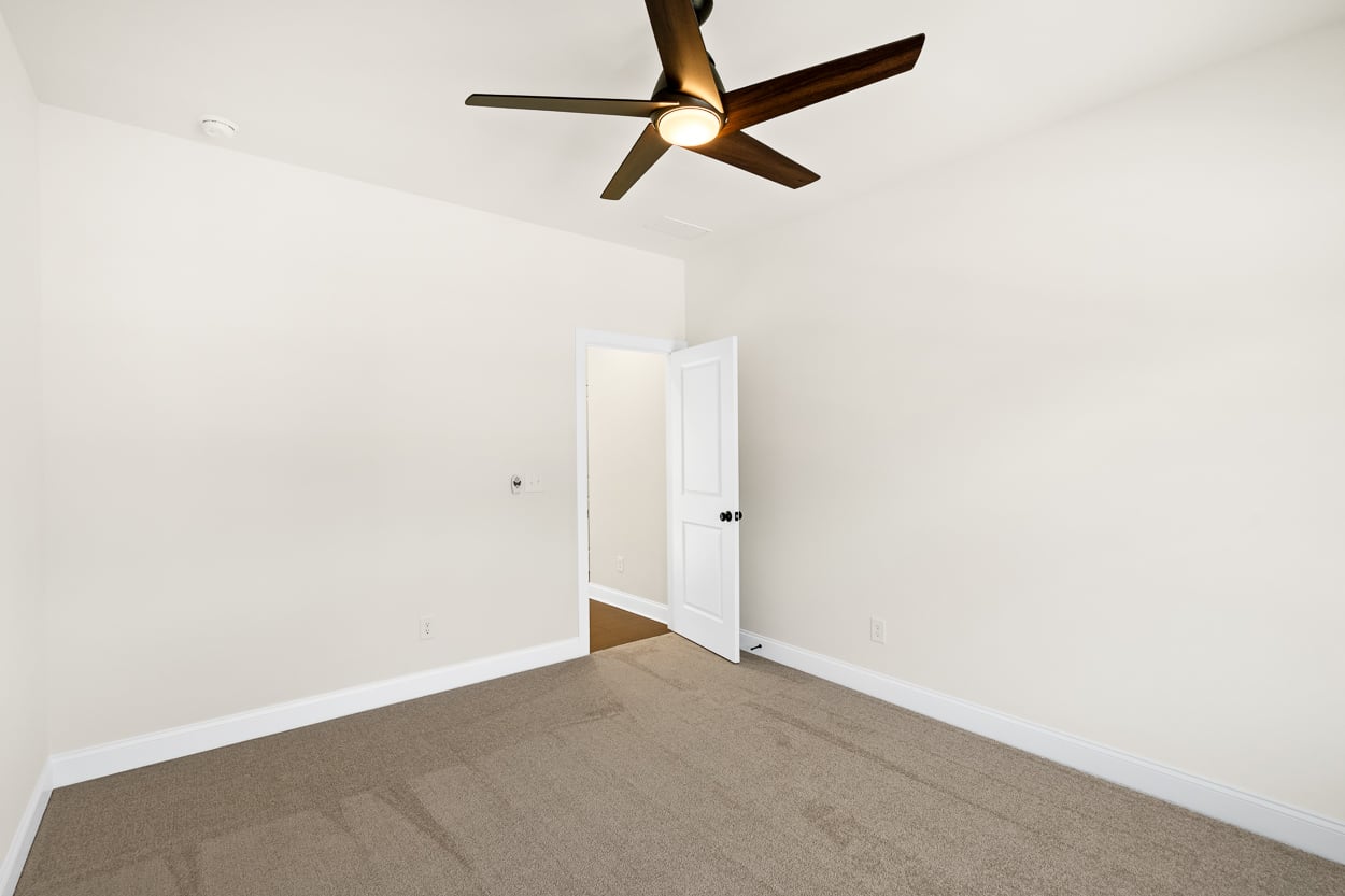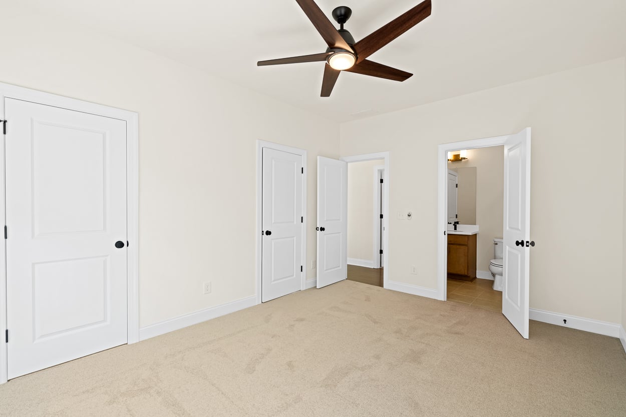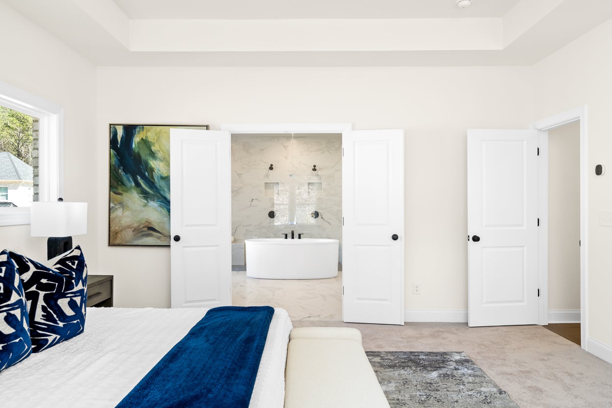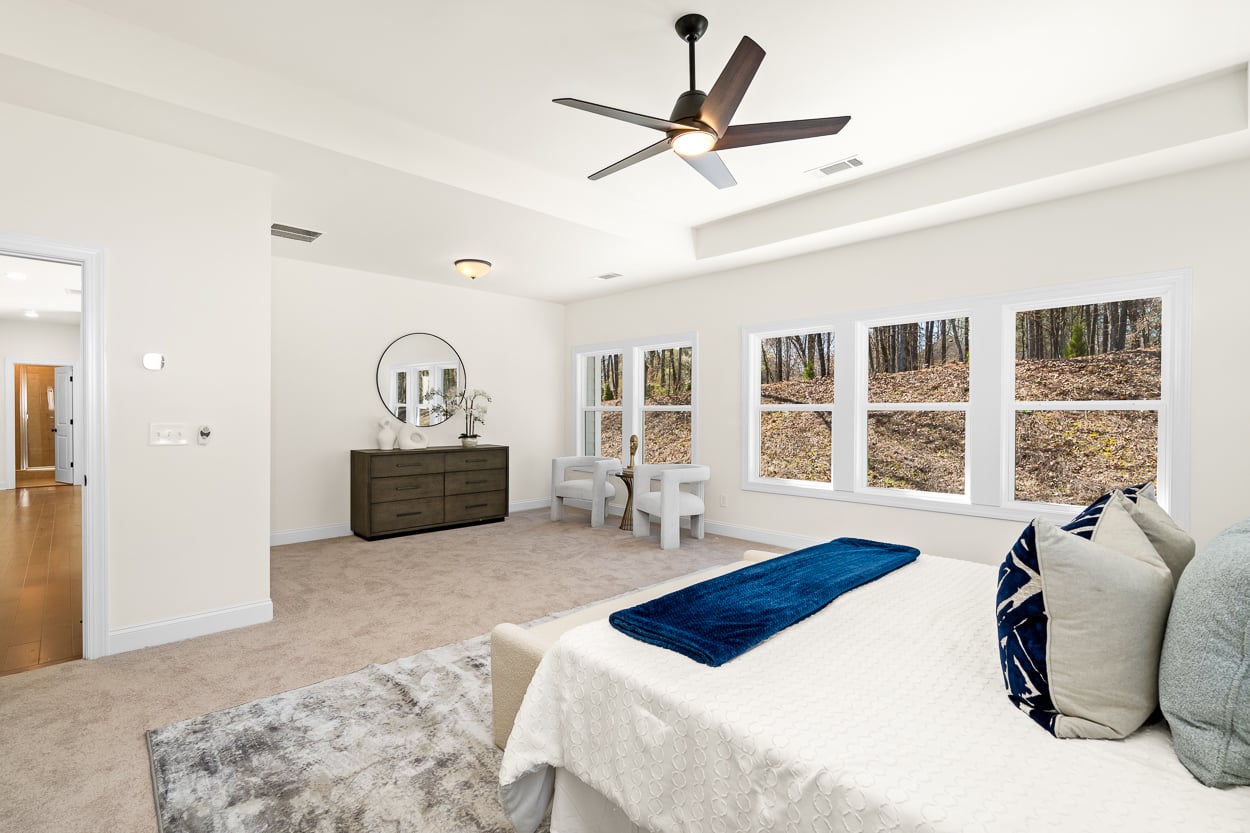 - Tray Ceiling with Designer Fan: Expansive suite with architectural detail and modern matte black ceiling fan