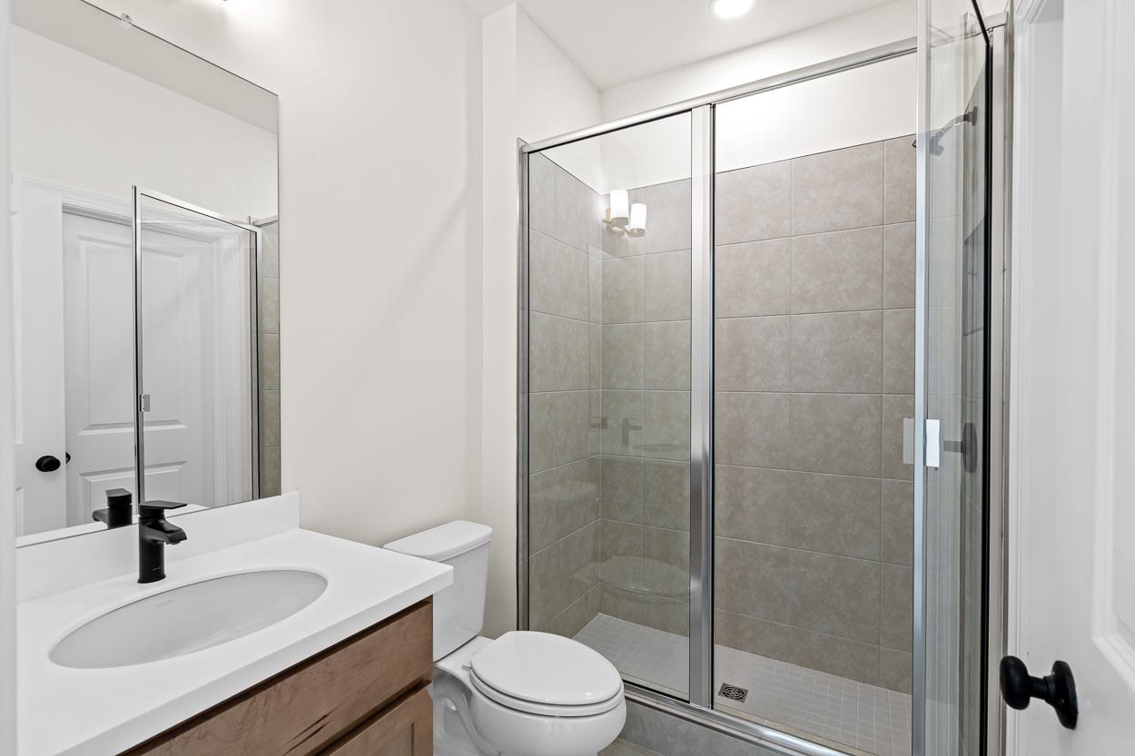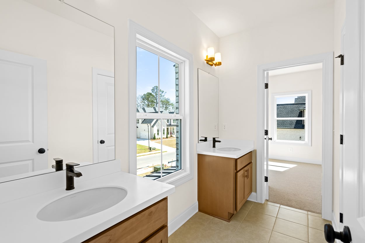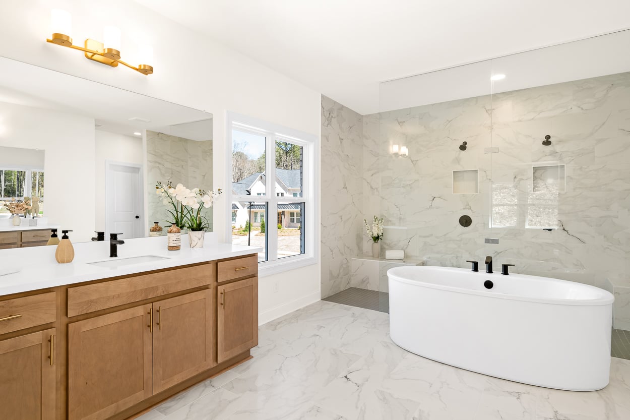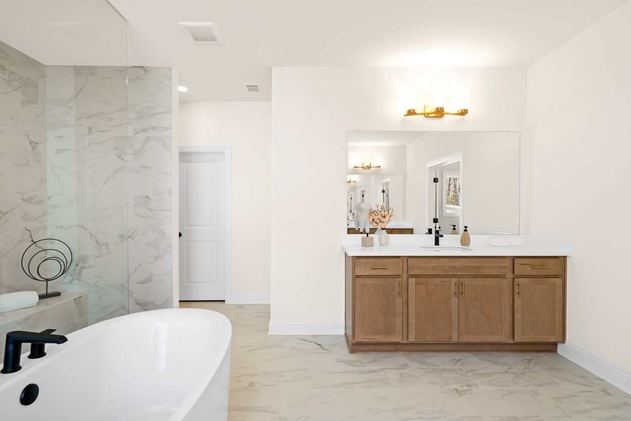 - His & Hers Vanities: Separated warm oak vanities, white quartz tops, matte black faucets, gold sconce lighting