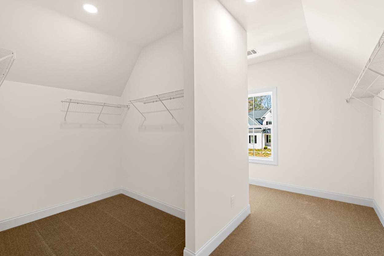 - His & Hers Walk-In Closets: Oversized closets with vaulted ceilings and natural light